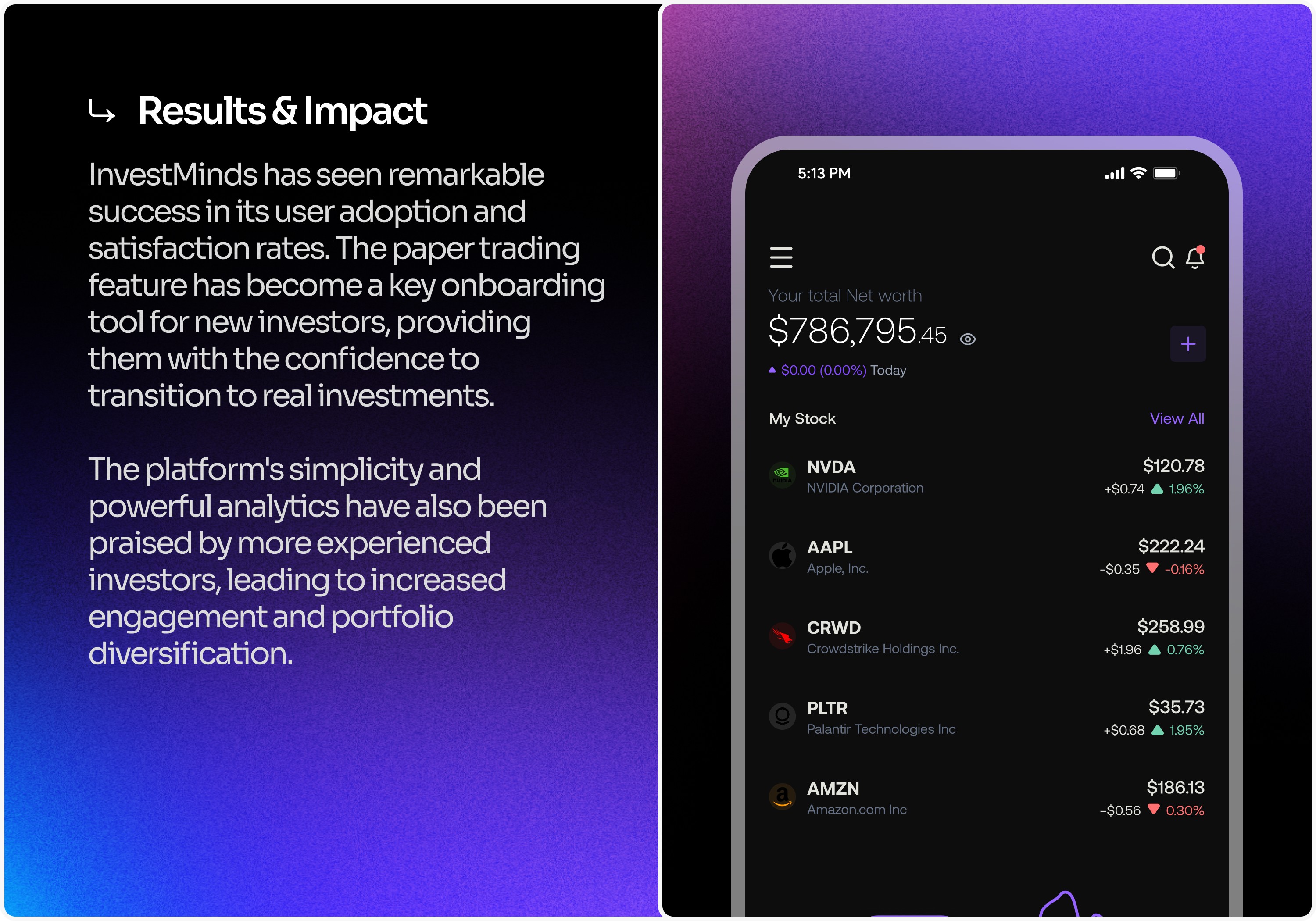 The result was a platform that empowered users to make informed decisions regardless of their experience level. New investors gained the confidence to start their investment journey through paper trading and accessible insights, while experienced traders appreciated the speed and reliability of the streamlined process. By combining clarity with depth, the design positioned InvestMinds as a platform that could grow with its users, offering value at every stage of their investment journey.