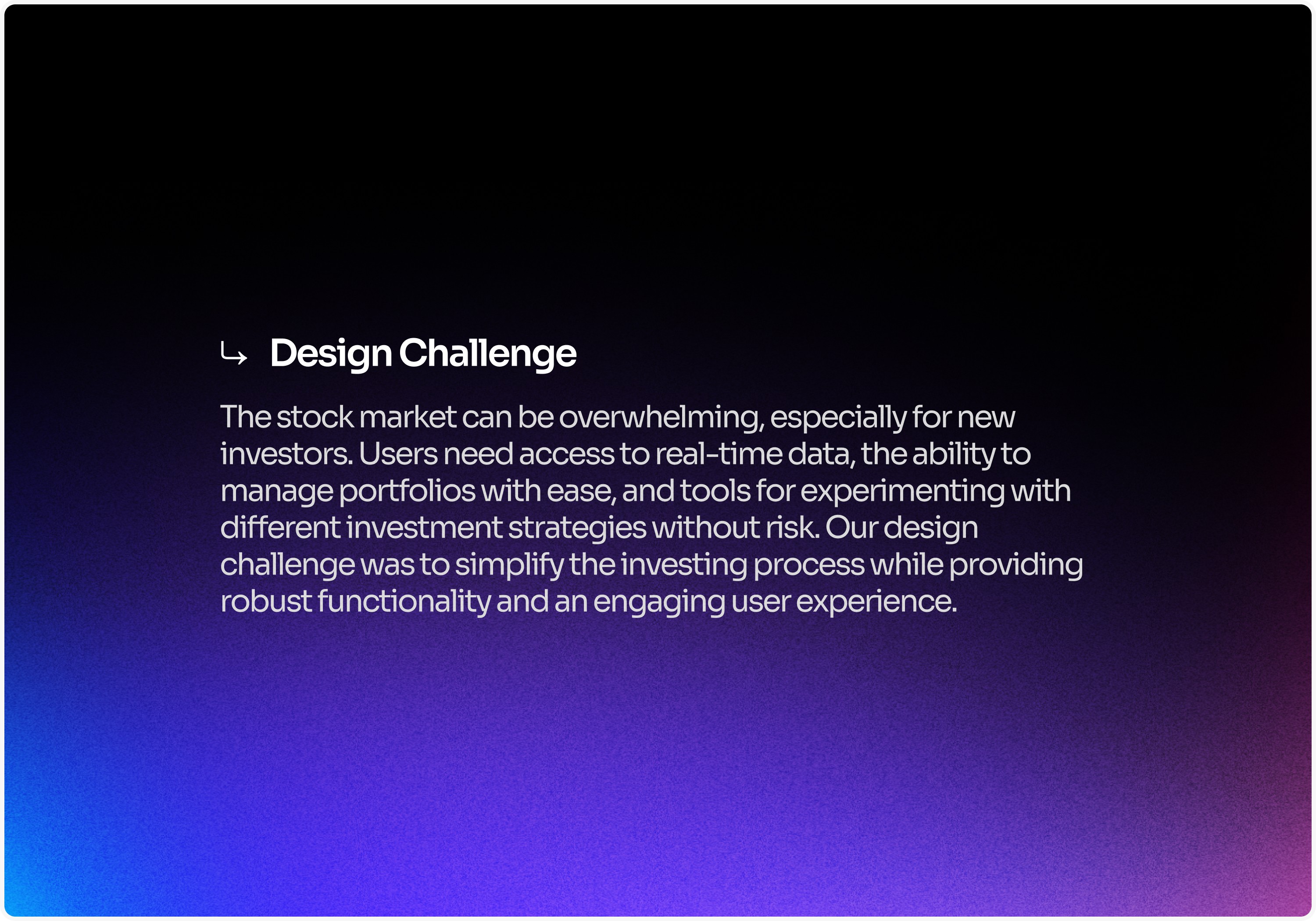 My design process focused on accessibility, usability, and engagement. I designed intuitive dashboards that presented market data in a clear, digestible way, ensuring that users could quickly understand insights without being overwhelmed. For beginners, I introduced a paper trading feature that allowed them to practice and learn without financial risk, helping them build confidence before committing real funds. For advanced investors, I ensured real-time data accuracy and streamlined the process of executing trades to reduce unnecessary steps. The overall design was anchored in simplicity and clarity, with an emphasis on reducing barriers to entry while keeping the experience robust enough for professionals.