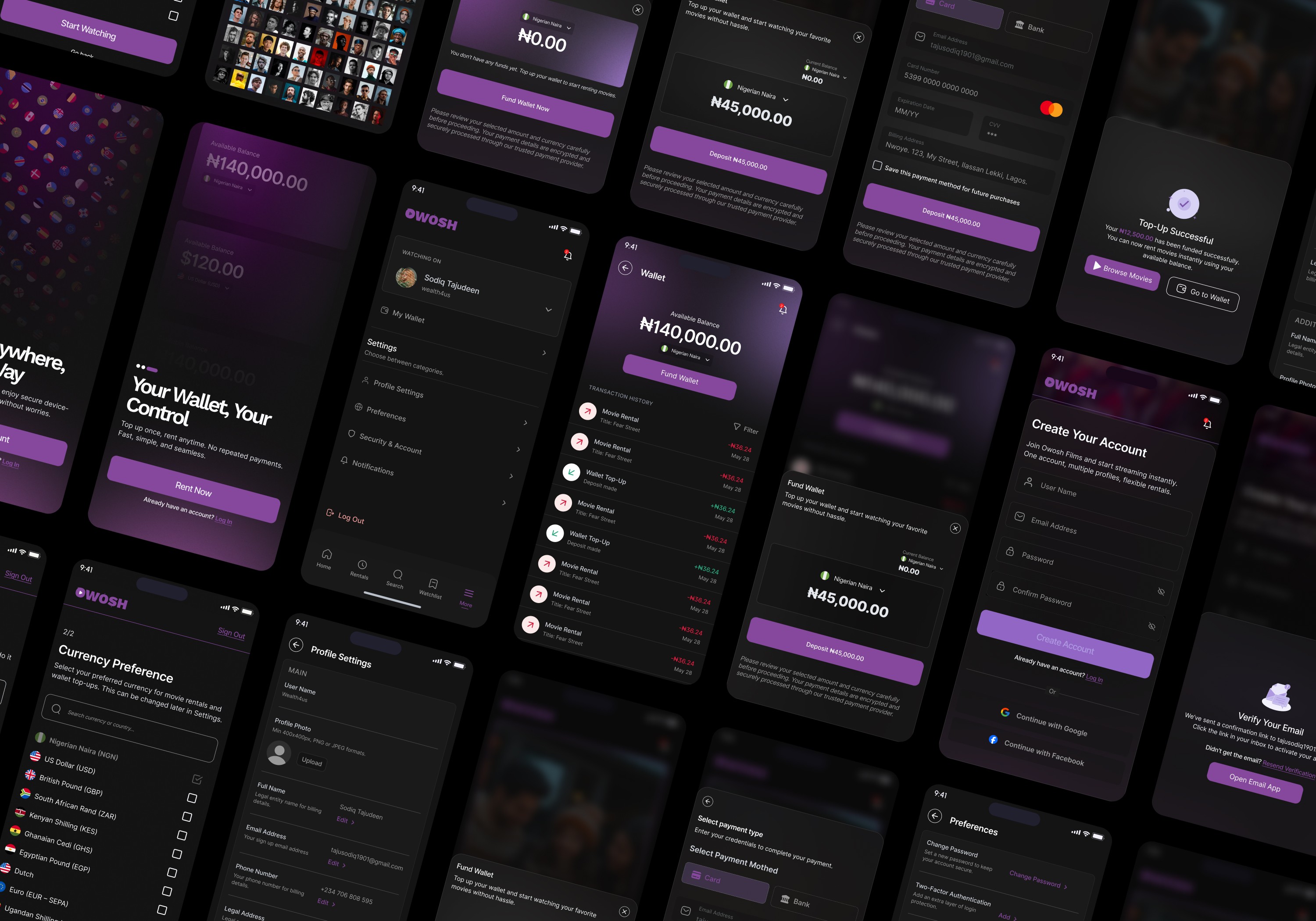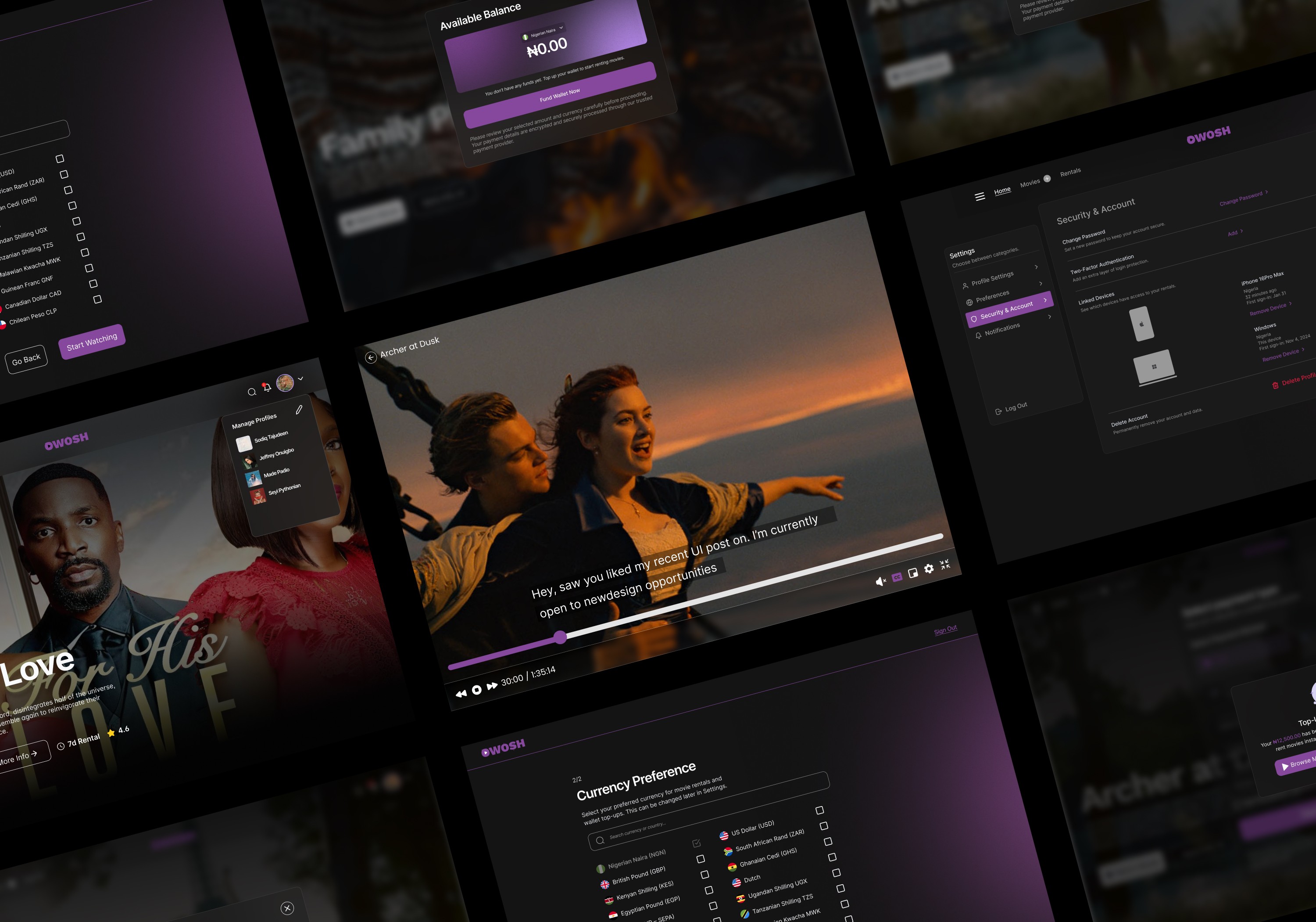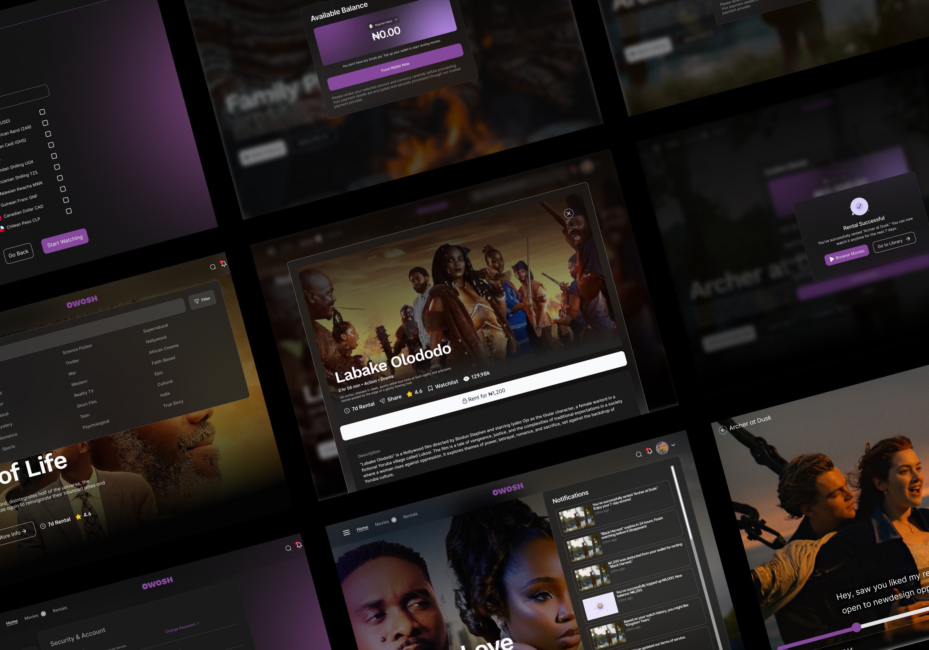 Owosh Films is a secure, pay-per-view movie streaming platform designed to solve challenges in the African entertainment space. The product enables users to rent movies flexibly, pay in their local currency, and enjoy personalized streaming experiences across web and mobile. As the Product Designer, I led the end-to-end design of the platform, including the web app, mobile app, and admin dashboard, ensuring the system was not only user-friendly but also scalable for future growth.